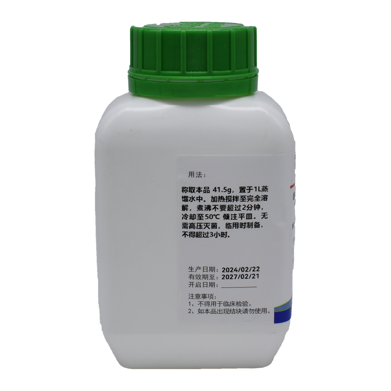 稱取本品 41.5g ,置于 1L 蒸餾水中。加熱攪拌至完全溶解,煮沸不要超過 2min ,冷卻至 50℃傾注平皿。 無(wú)需高壓滅菌,臨用時(shí)制備,不得超過 3 小時(shí)。