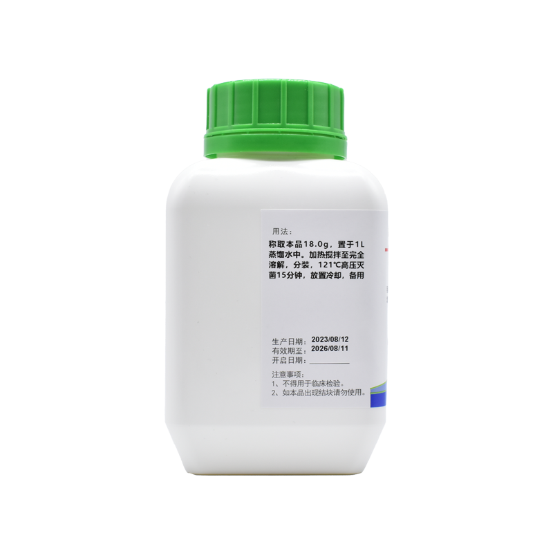 稱取本品18.0g,置于1L蒸餾水中。加熱攪拌至完全溶解,分裝,121℃高壓滅菌15分鐘,放置冷卻,備用。