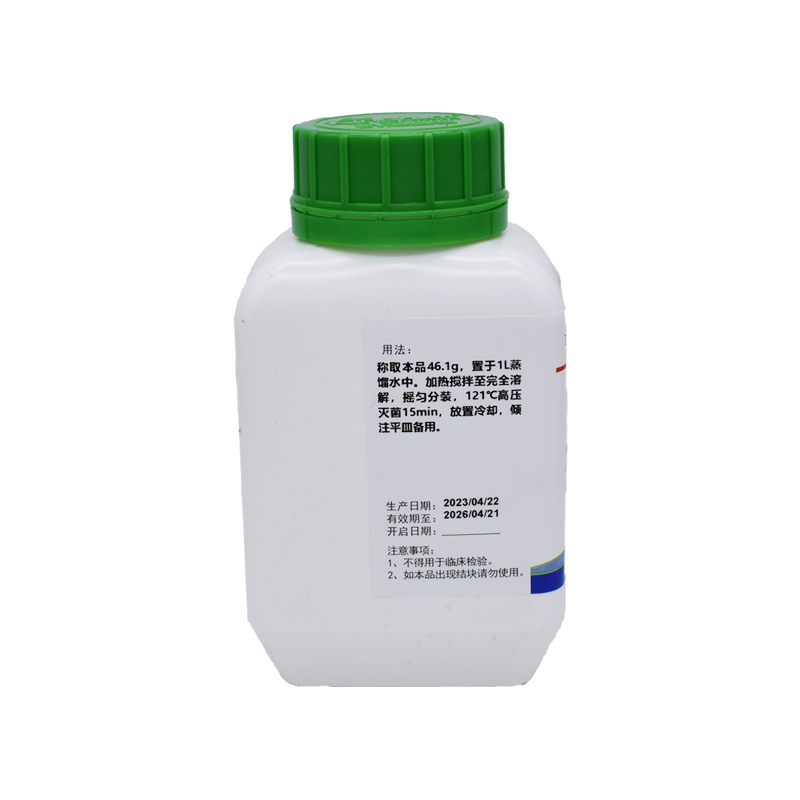 稱取本品46.1g,置于1L蒸餾水中。加熱攪拌至完全溶解,搖勻分裝,121℃高壓滅菌15min,放置冷卻,傾注平皿備用。